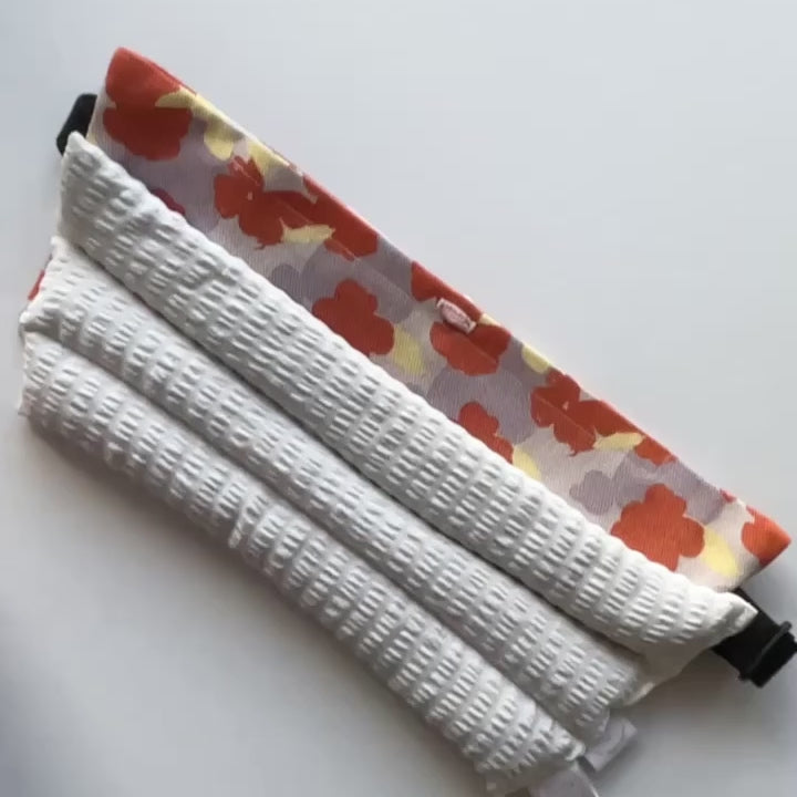 Designed to wrap around your body, I am like a warm cuddle for when you have pelvic or lower back pain. I have an adjustable strap, so you can position me wherever feels most comfortable. The wheat bag fits perfectly in the pouch. It is slim, and can be worn on top or underneath clothing.